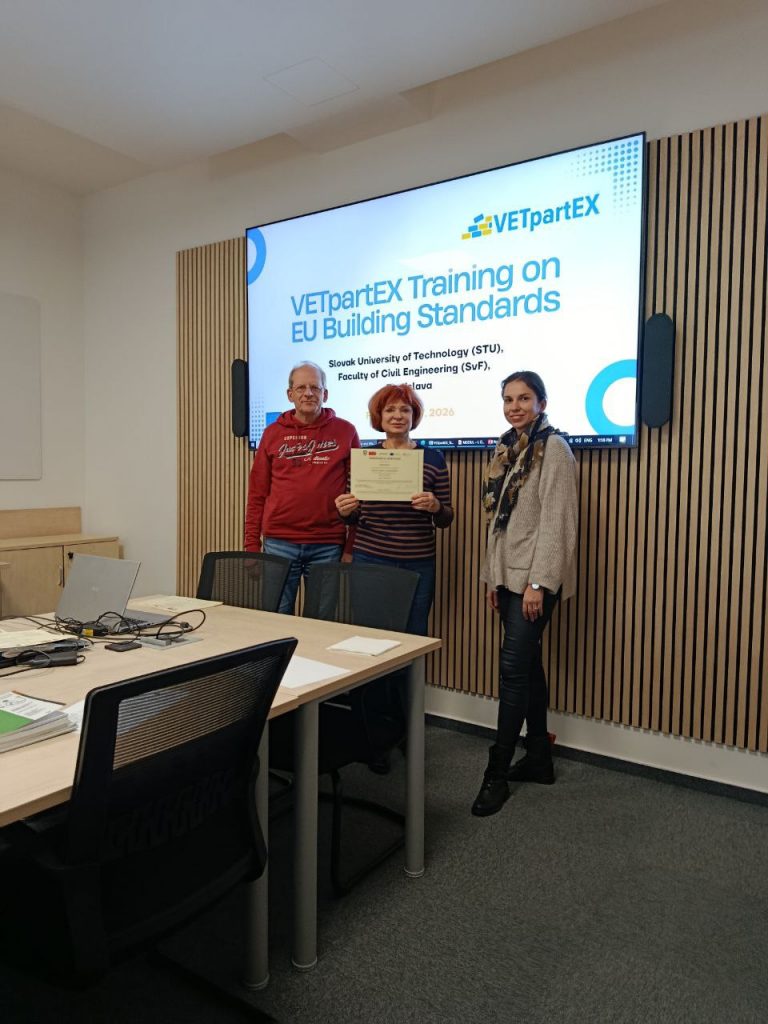 From February 9 to 17, 2026, at the Slovak University of Technology in Bratislava, at the Faculty of Civil Engineering, in accordance with the implementation plan of the international project “VETpartEx – Future-Oriented Vocational Education for the Construction Sector of Ukraine” under the Erasmus + KA2 program, an internship on the topic “Building Standards of the European Union” was held, in which teachers of the Ukrainian State University of Science and Technology took part. Anastasia HAIDAR, Olena KOVAL, Yevhen YURCHENKO, Oleksandr TREНUB (online).