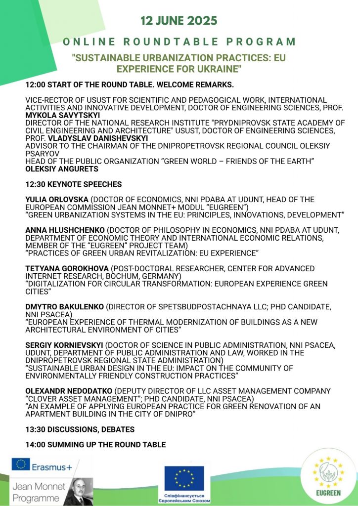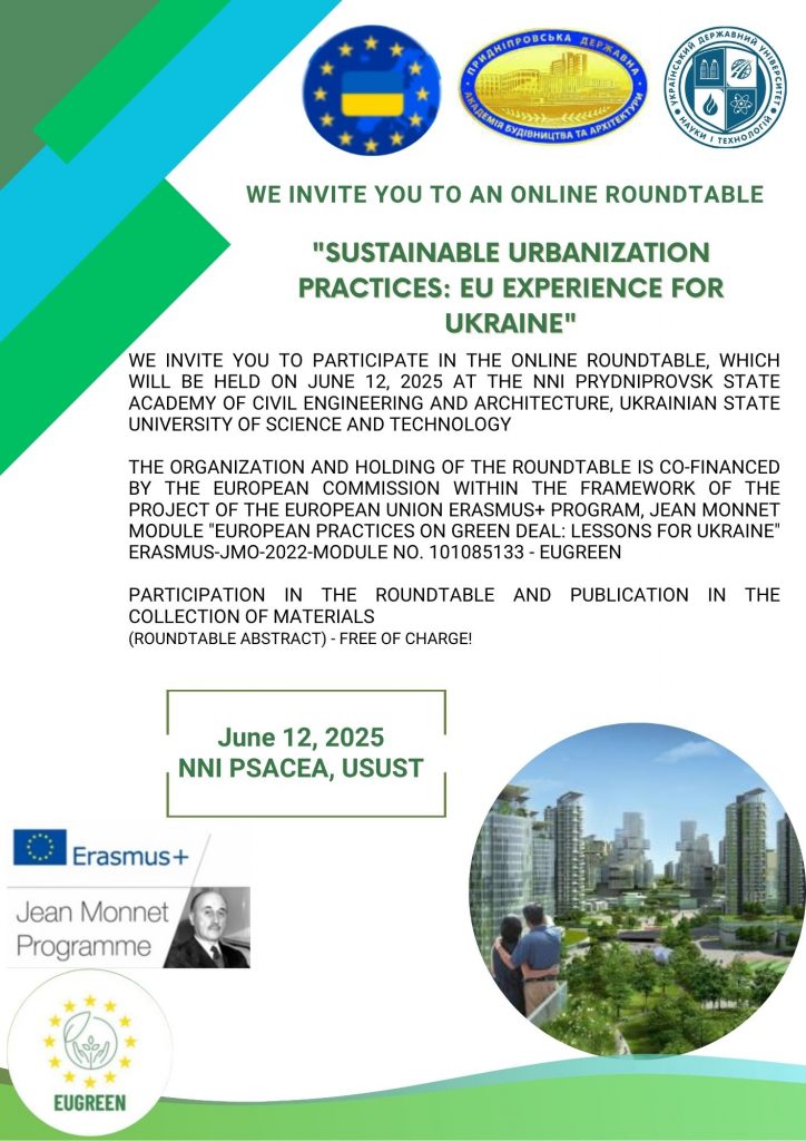 We invite you to participate in the online Roundtable “Sustainable Urbanization Practices: EU Experience for Ukraine”, which will be held on June 12, 2025. Start at 12:00.