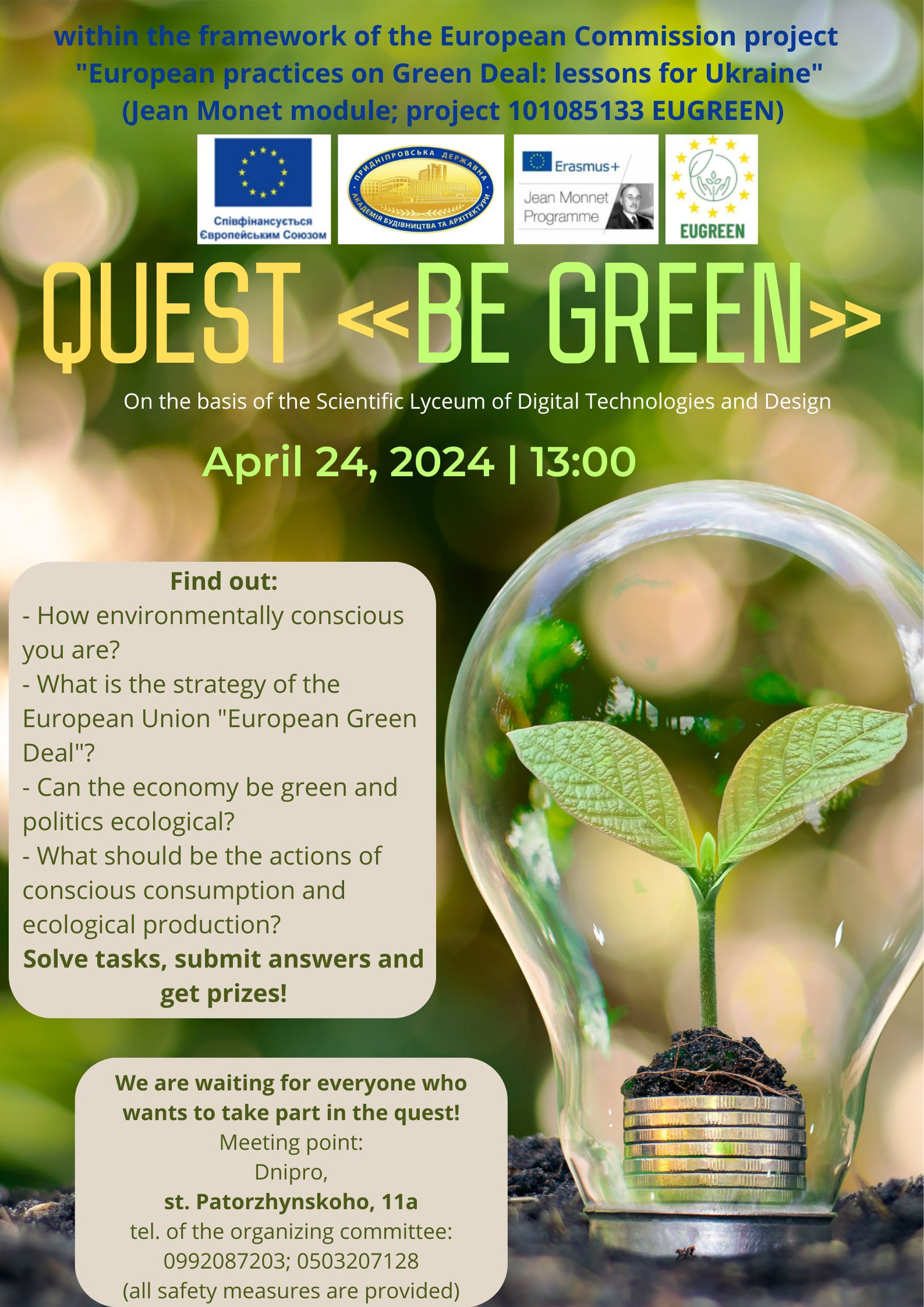 On April 24, 2024, within the framework of the European Commission project “European Green Deal Practices: Lessons for Ukraine” (Jean Monnet Module; project 101085133 EUGREEN), an interesting event took place – a quest for the younger generation “Be Green”.