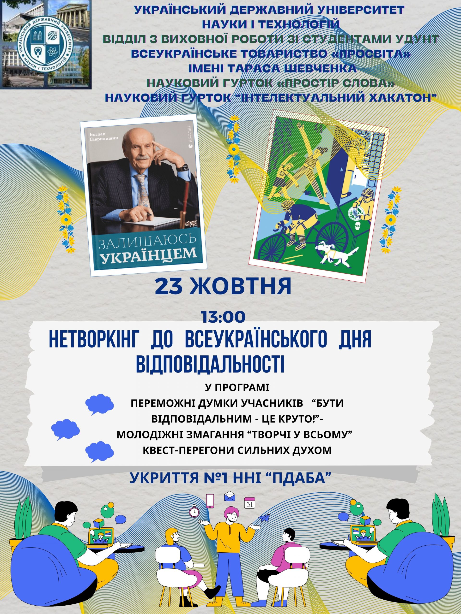Вже другий рік поспіль учні ліцею цифрових технологій та дизайну УДУНТ є активними учасниками «Всеукраїнського Дня відповідальності», який вже традиційно проводиться в ННІ ПДАБА українського університету науки і технологій. Всеукраїнський День відповідальності – це державне свято, присвячене дню народження видатного українця Богдана Гаврилишина, автора «Декларації відповідальності людини». Метою відзначення є не тільки вшанування пам’яті великого українця у день його народження 19 жовтня, але якісних перетворень в українському суспільстві у контексті розуміння та підвищення рівня відповідальності кожного українця, які набули особливої актуальності під час повномасштабної війни.