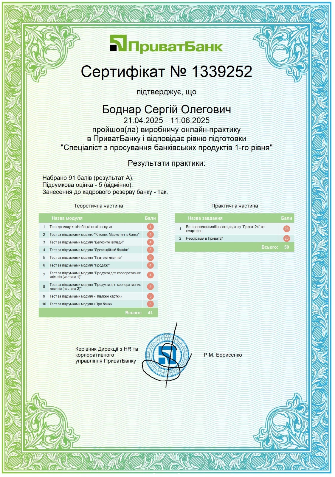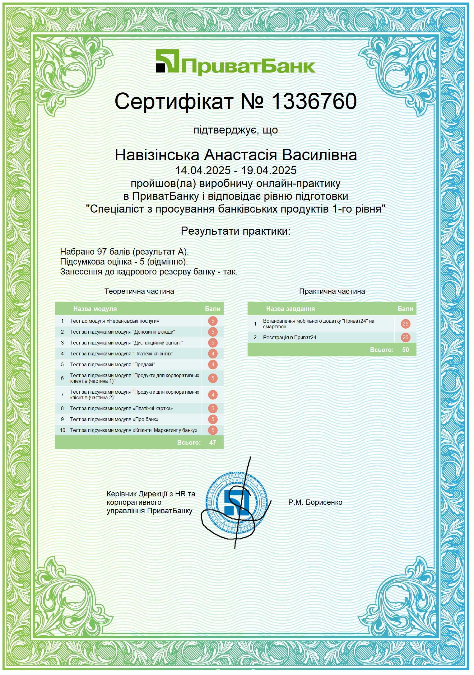 У період з 14 квітня по 30 травня 2025 року студенти освітньої програми «Фінансове управління бізнесом» спеціальності 075 «Фінанси, банківська справа, страхування та фондовий ринок» групи ФІН-22 Бондар Сергій та Навізінська Анастасія успішно поєднали виробничу практику з інструментами неформальної освіти на базі КБ «ПриватБанк».