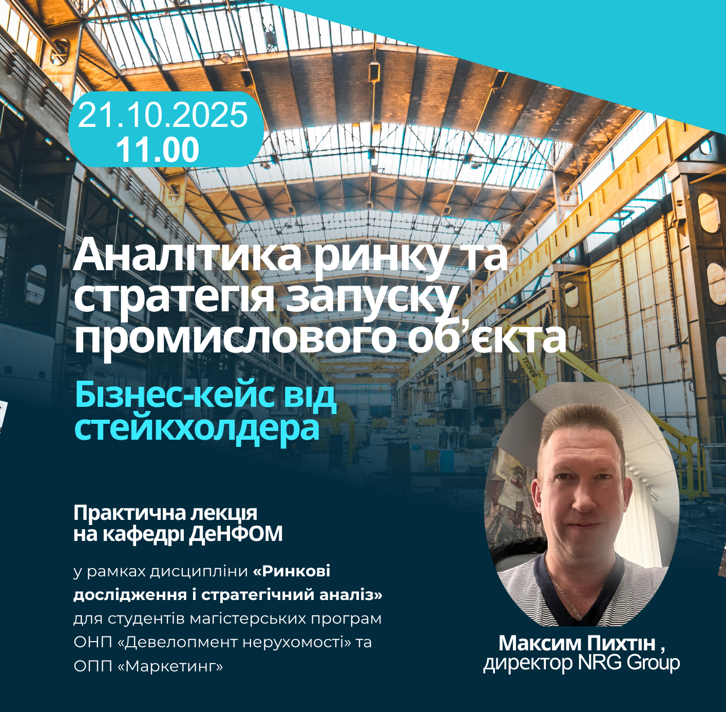 На кафедрі ДеНФОМ ННІ ПДАБА 12 жовтня 2025 року у рамках дисципліни «Ринкові дослідження і стратегічний аналіз» відбулася практична онлайн-лекція для студентів магістерських програм «Девелопмент нерухомості» та «Маркетинг». Спікером заходу виступив представник бізнесу – директор NRG Group Максим Пихтін – стейкхолдер промислового проєкту зі створення заводу з виробництва гофротари та картону, який поділився практичним досвідом розроблення інвестиційного проєкту від етапу ринкових досліджень до фінансового обґрунтування.