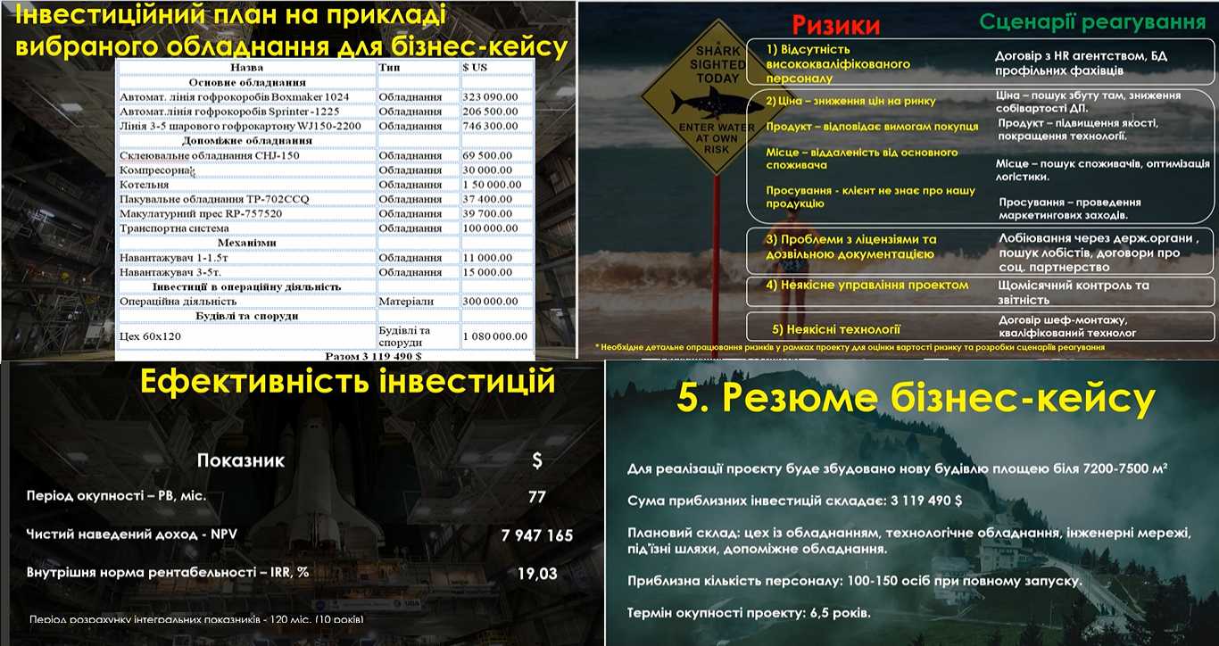 Під час лекції студенти ознайомилися з тенденціями розвитку ринку пакувальних матеріалів; методикою оцінки ємності ринку, конкурентного середовища та споживчого попиту; процесом підбору основного виробничого обладнання; ключовими фінансовими показниками ефективності проєкту; прикладом підготовки резюме бізнес-кейсу для потенційних інвесторів.
