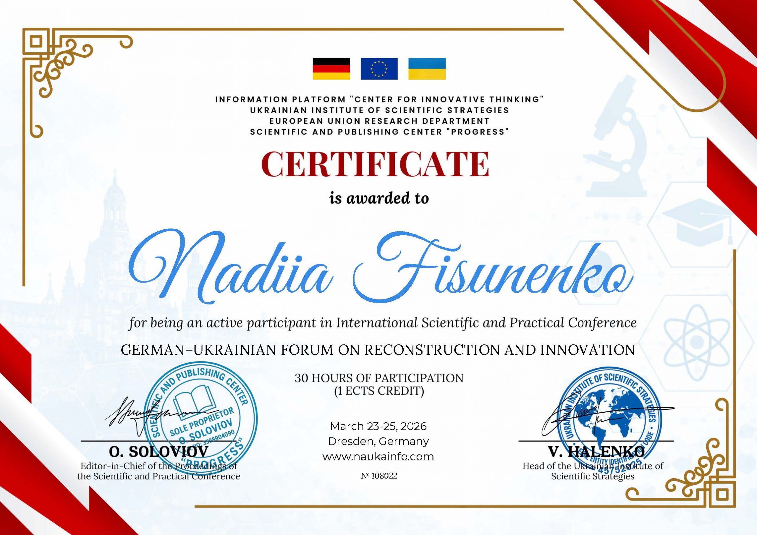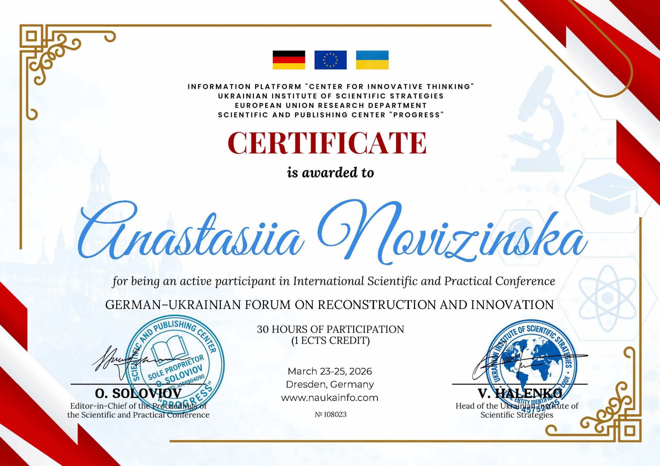 Результати конкурсного дослідження апробовано на Міжнародній науково-практичній конференці German–Ukrainian forum on reconstruction and innovation», що відбулася у місті Дрезден (Німеччина). Участь у міжнародній конференції також надала можливість долучитися до громадського проєкту «Лідери сучасної науки».