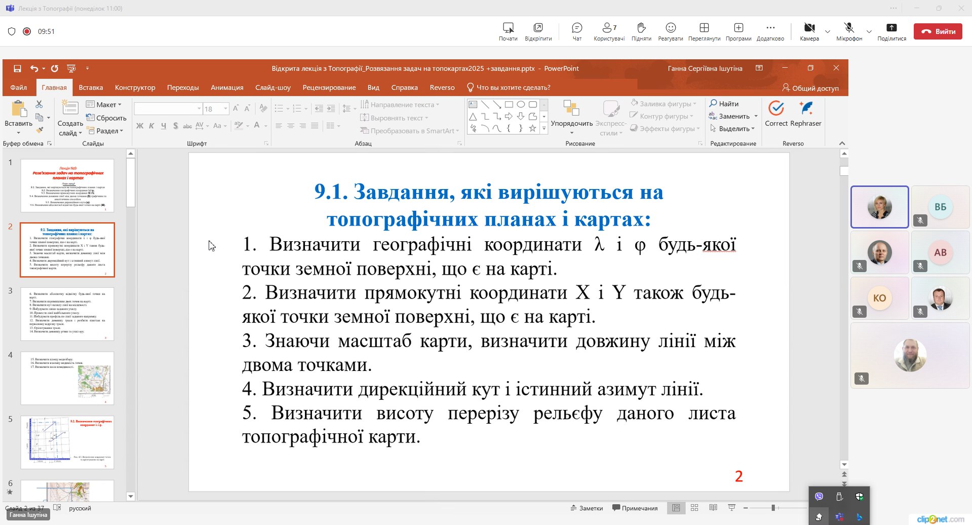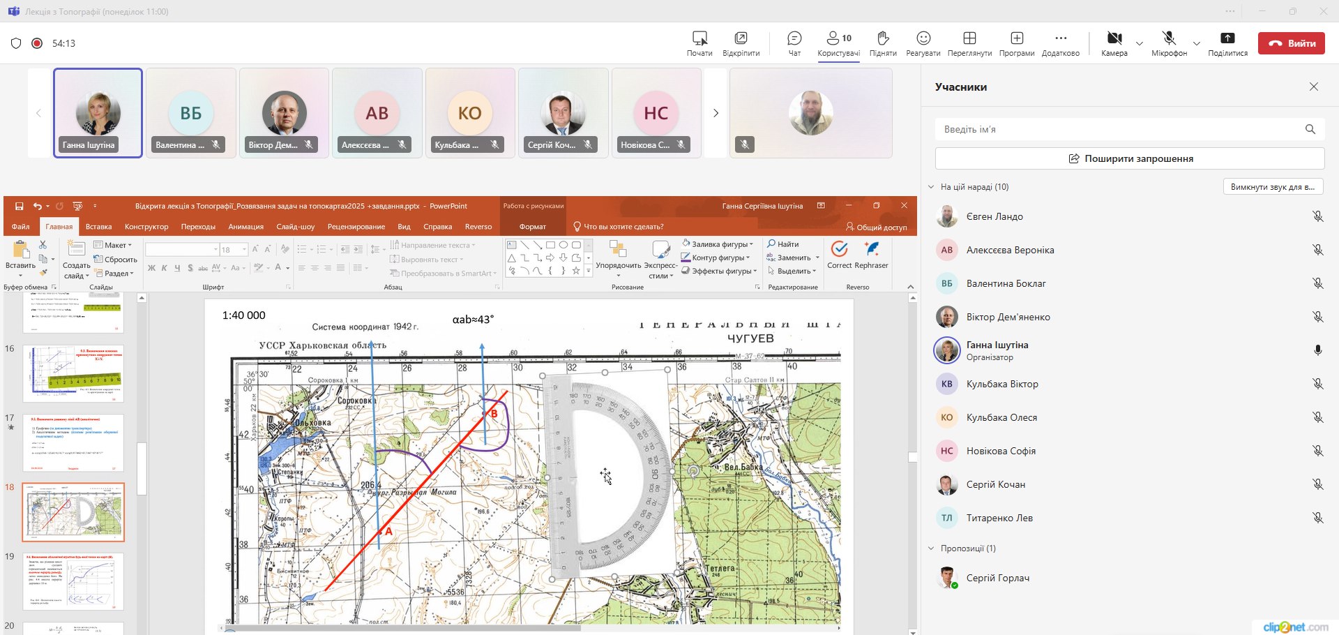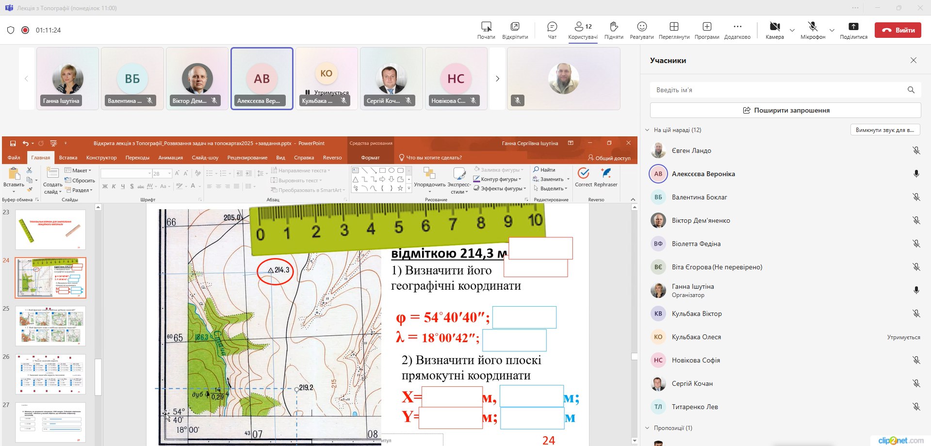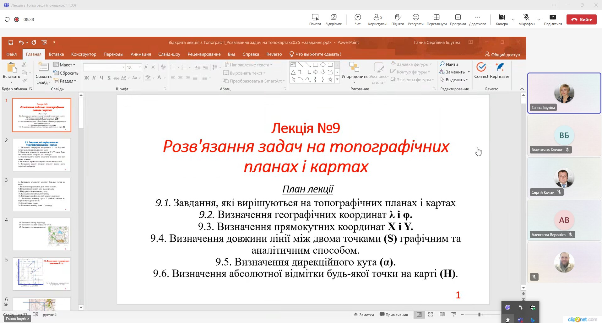 29.09.2025 р. відбулась відкрита лекція к.т.н., доцента кафедри автомобільних доріг, геодезії та землеустрою Ішутіної Ганни Сергіївни на тему «Розв’язання задач на топографічних планах і картах». Відкрита лекція була проведена для студентів групи ГІЗ-25. За планом лекції були розглянуті завдання, які вирішуються на топографічних планах і картах. Були визначені географічні (φ, λ), а також плоскі прямокутні координати (X, Y) точок. Розглянуто на прикладах визначення довжини лінії між двома точками (S) графічним та аналітичним способом, а також визначення дирекційного кута (α). Студенти навчились визначати абсолютні відмітки будь-якої точки на карті (Н).