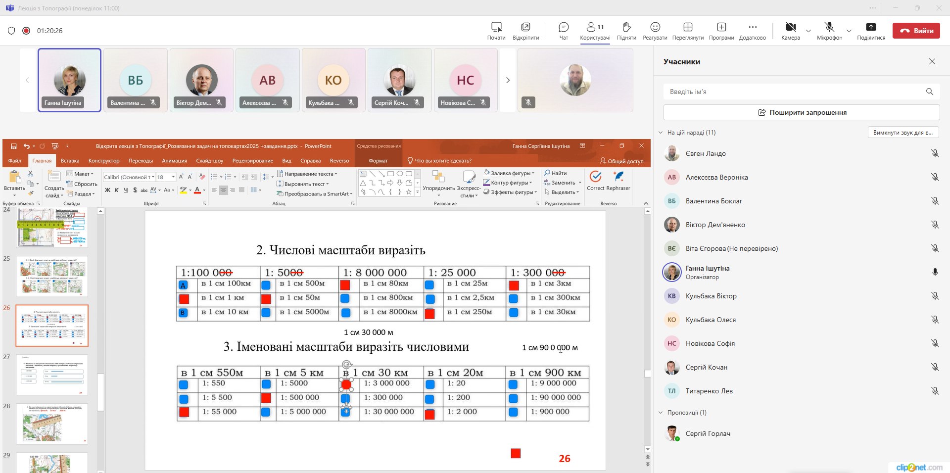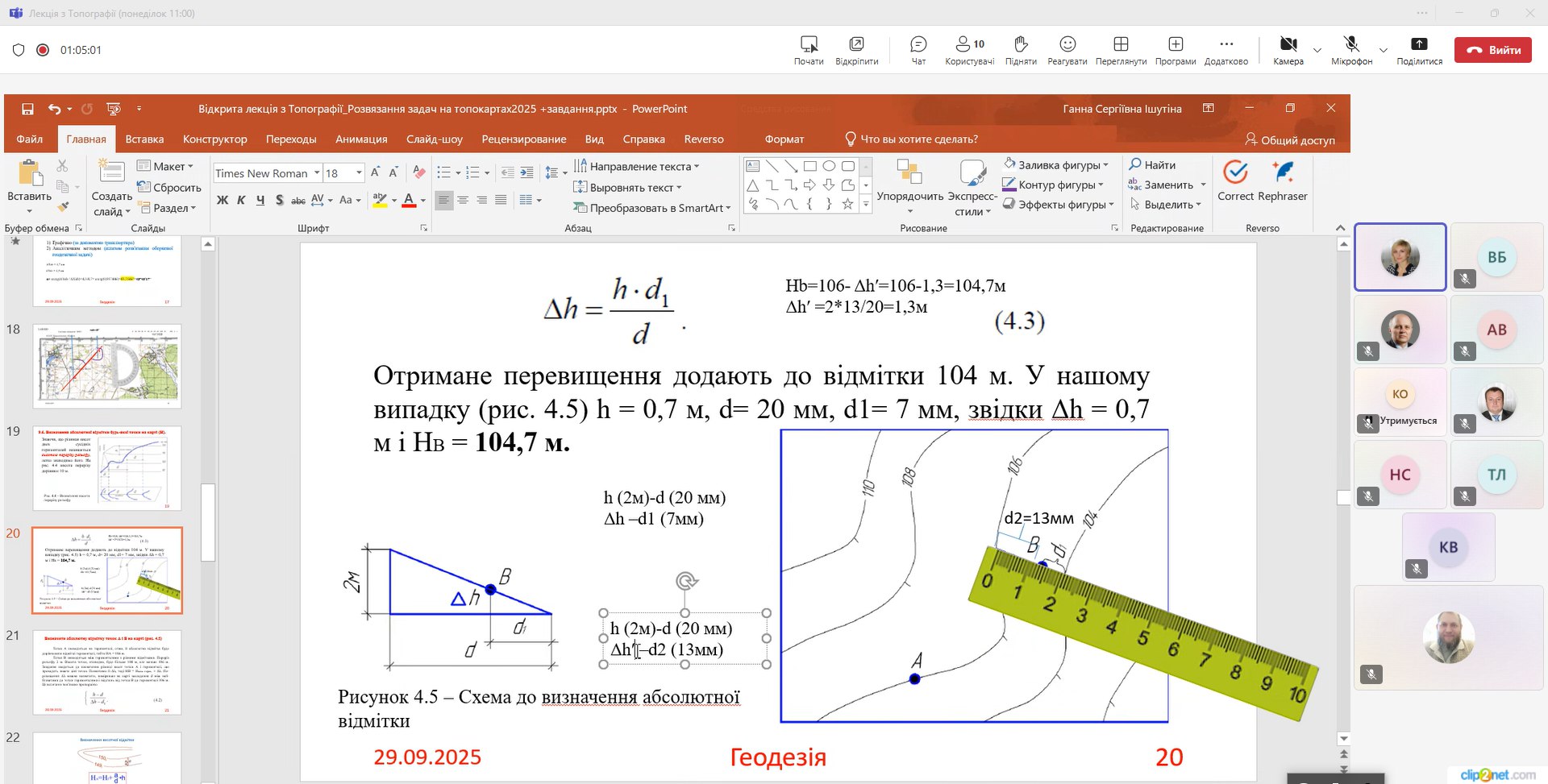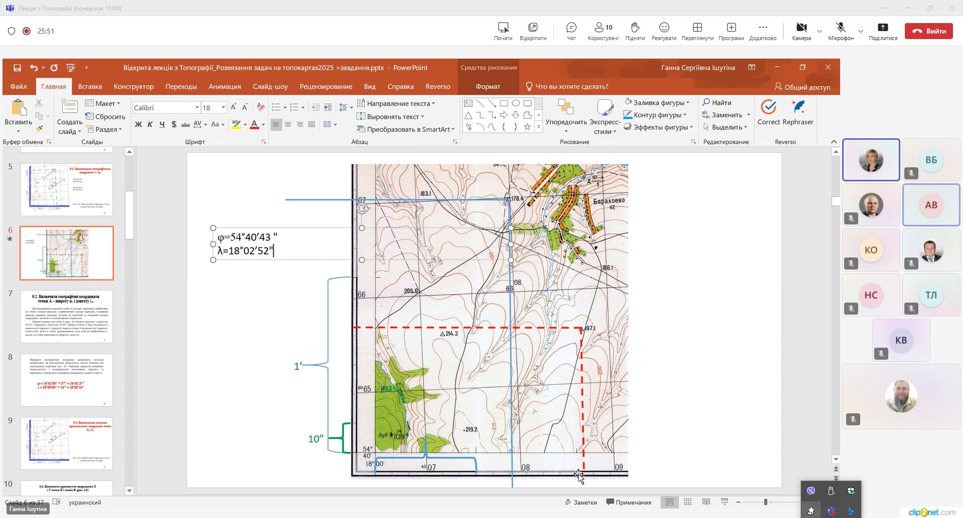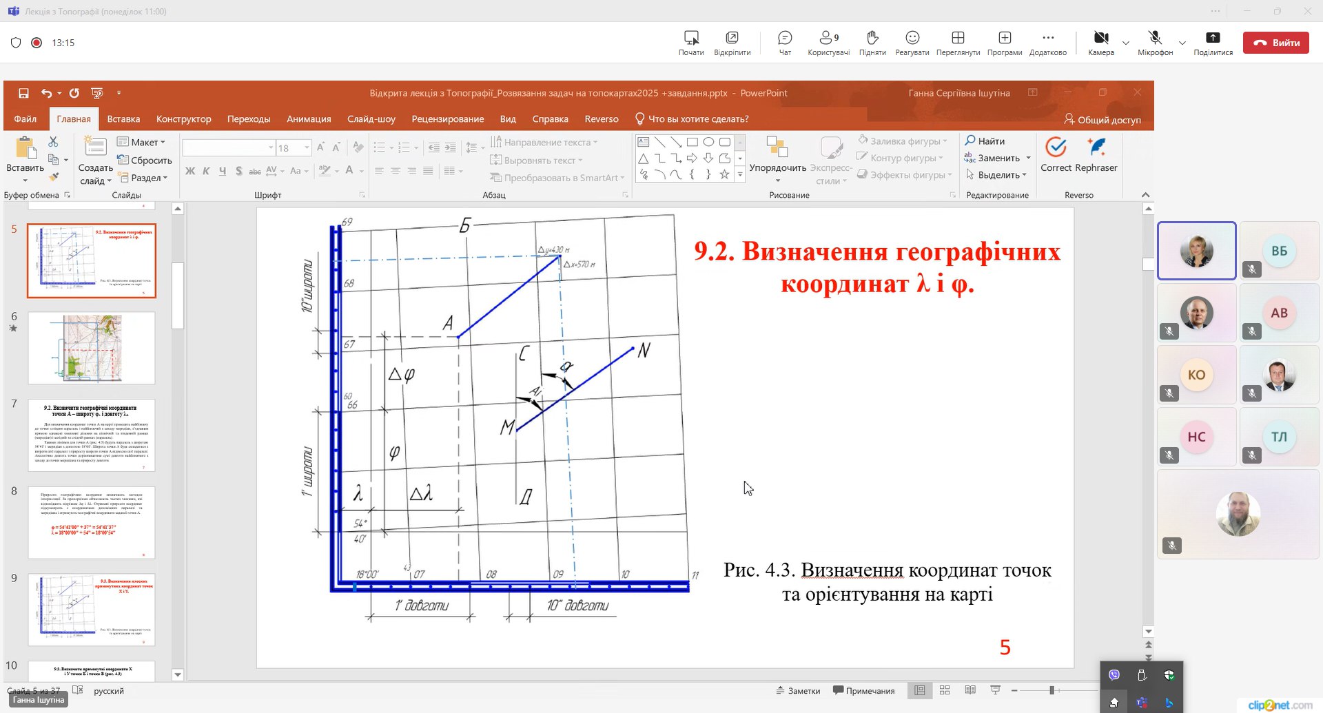 29.09.2025 р. відбулась відкрита лекція к.т.н., доцента кафедри автомобільних доріг, геодезії та землеустрою Ішутіної Ганни Сергіївни на тему «Розв’язання задач на топографічних планах і картах». Відкрита лекція була проведена для студентів групи ГІЗ-25. За планом лекції були розглянуті завдання, які вирішуються на топографічних планах і картах. Були визначені географічні (φ, λ), а також плоскі прямокутні координати (X, Y) точок. Розглянуто на прикладах визначення довжини лінії між двома точками (S) графічним та аналітичним способом, а також визначення дирекційного кута (α). Студенти навчились визначати абсолютні відмітки будь-якої точки на карті (Н).