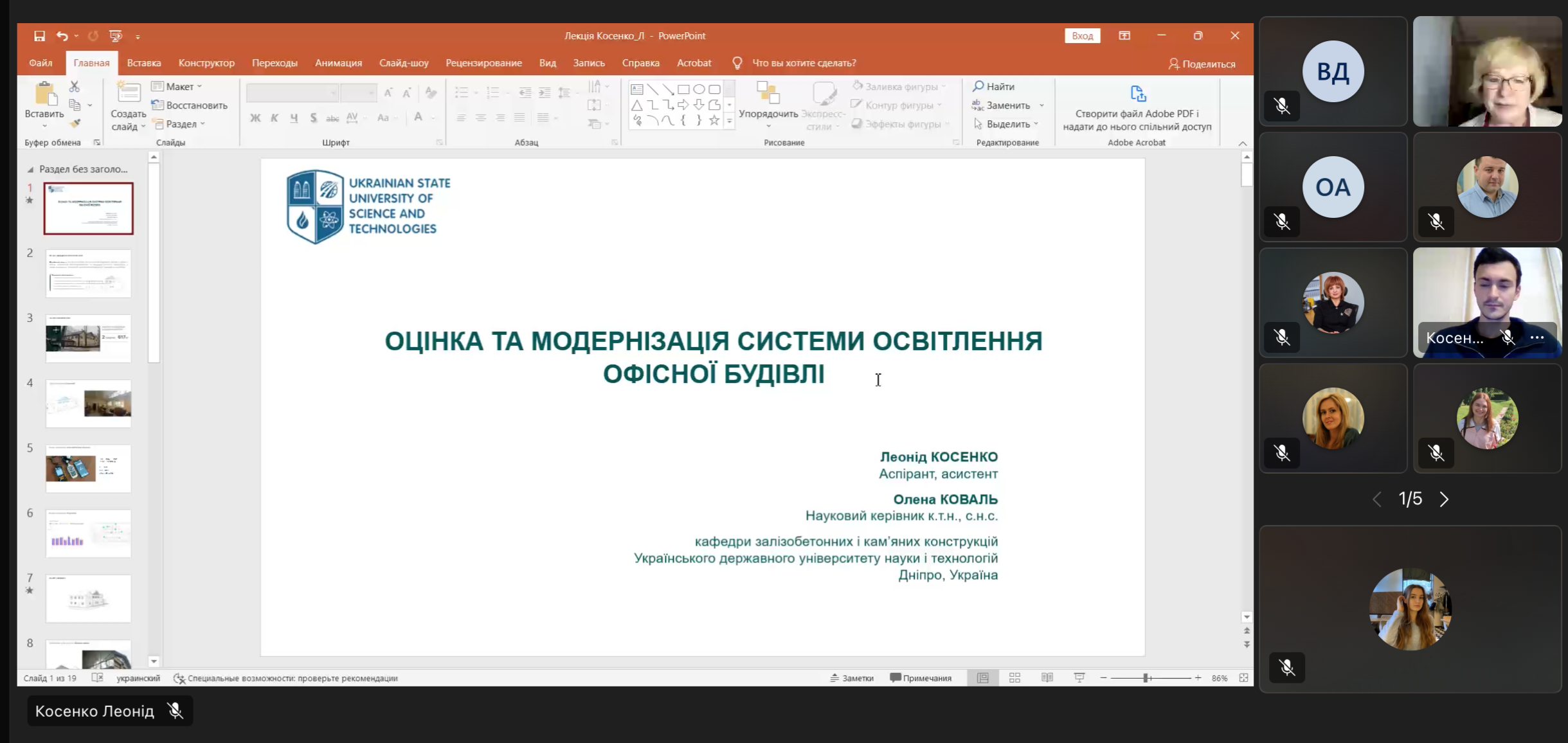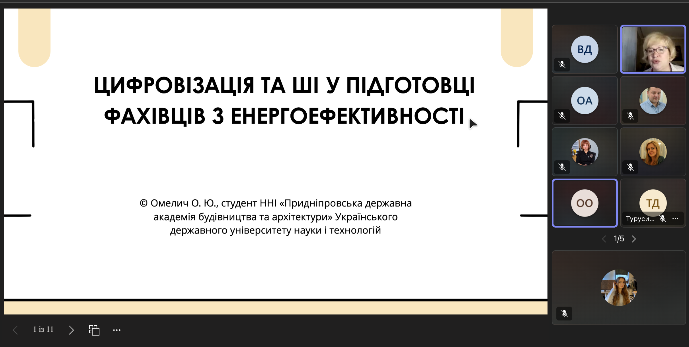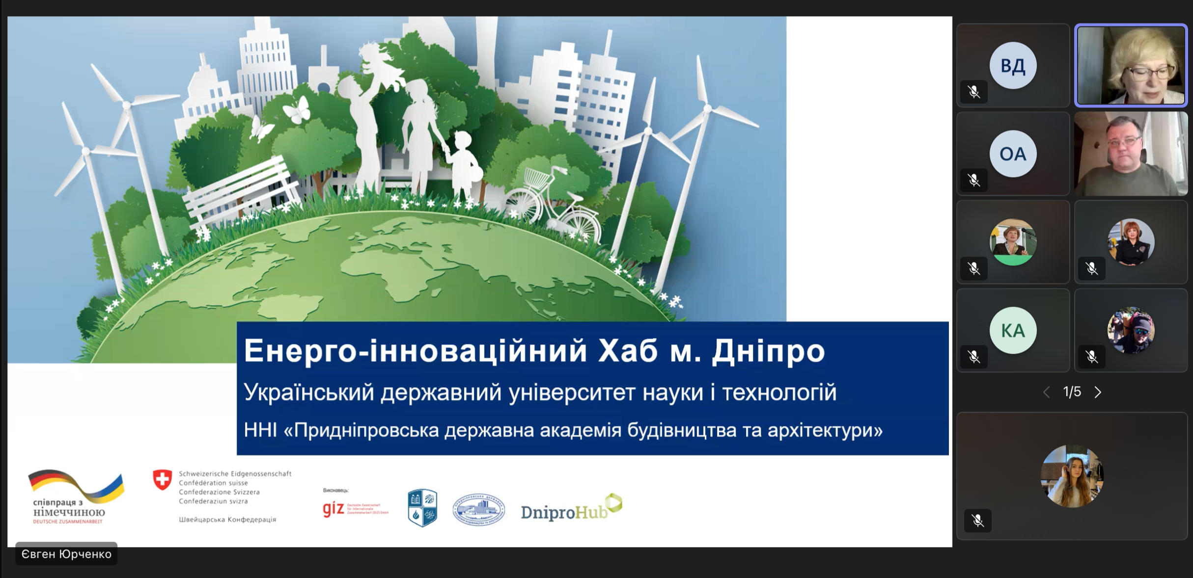 Керівник Енерго-інноваціного хабу м. Дніпро, к.т.н., доц., доцент кафедри ЗБК Євген Юрченко представив грунтовну доповідь на тему: «Енерго-інноваційний хаб м. Дніпро. Практична робота по просуванню енергоефективності та відбудові повоєнної України в УДУНТ».