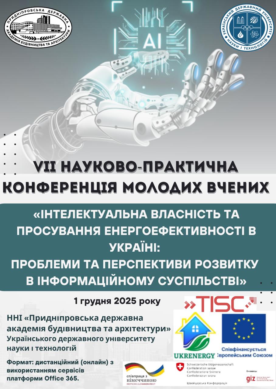 1-2 грудня у ННІ «ПДАБА» українського державного університету науки і технологій відбулась VII науково-практична конференція молодих вчених «ІНТЕЛЕКТУАЛЬНА ВЛАСНІСТЬ ТА ПРОСУВАННЯ ЕНЕРГОЕФЕКТИВНОСТІ В УКРАЇНІ:ПРОБЛЕМИ ТА ПЕРСПЕКТИВИ РОЗВИТКУ В ІНФОРМАЦІЙНОМУ СУСПІЛЬСТВІ». Основними тематичними напрямками конференції були:Інтелектуальна власність в архітектурно-будівельній галузі в умовах воєнного стану та викликів національної безпеки України; Професійна підготовка та кваліфікації у сфері енергоефективності як основа інноваційного розвитку та відбудови повоєнної України; Креативні індустрії як чинник економічного зростання в контексті права інтелектуальної власності; Охорона прав інтелектуальної власності та забезпечення академічної доброчесності в умовах використання штучного інтелекту в освіті та науці.