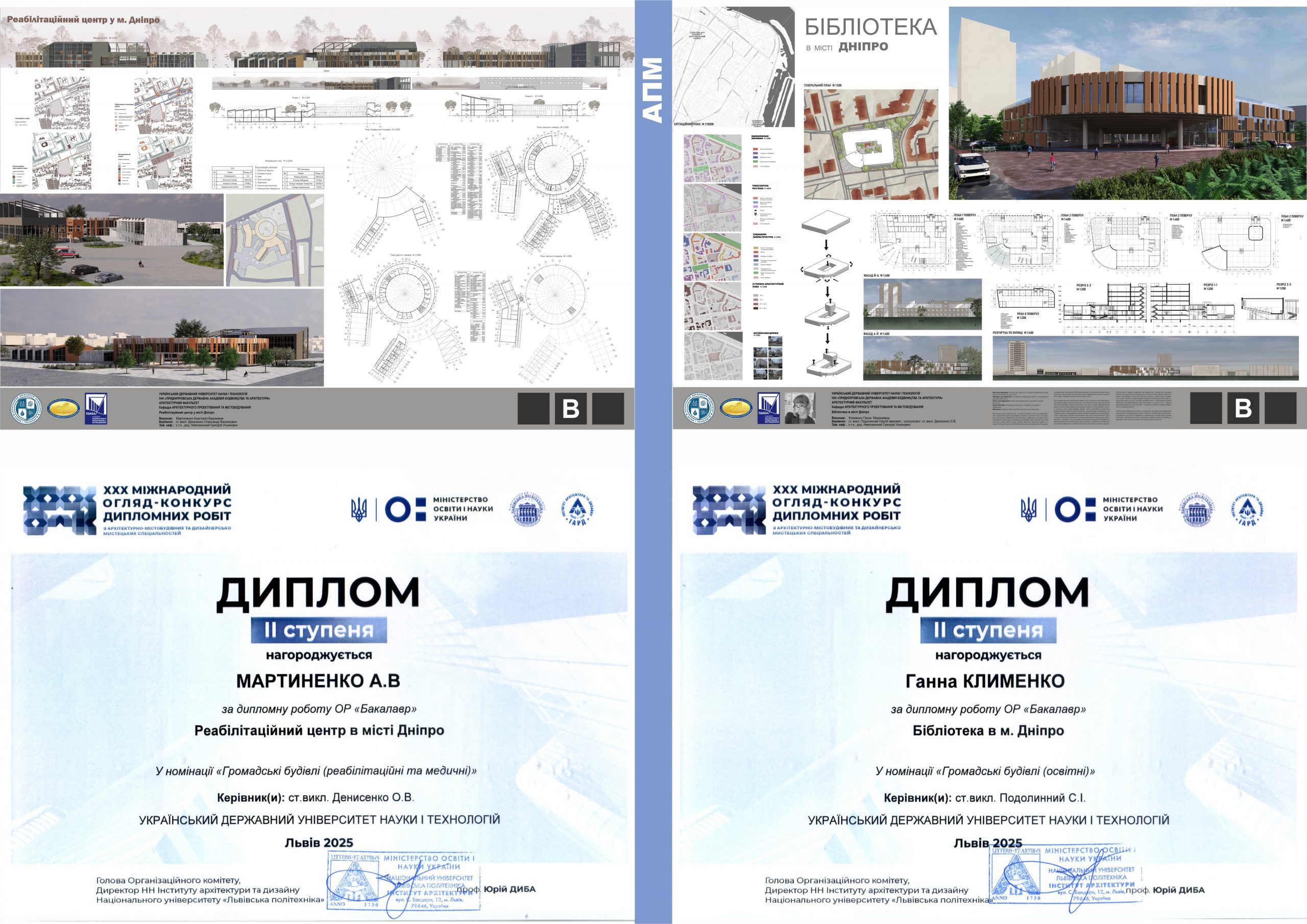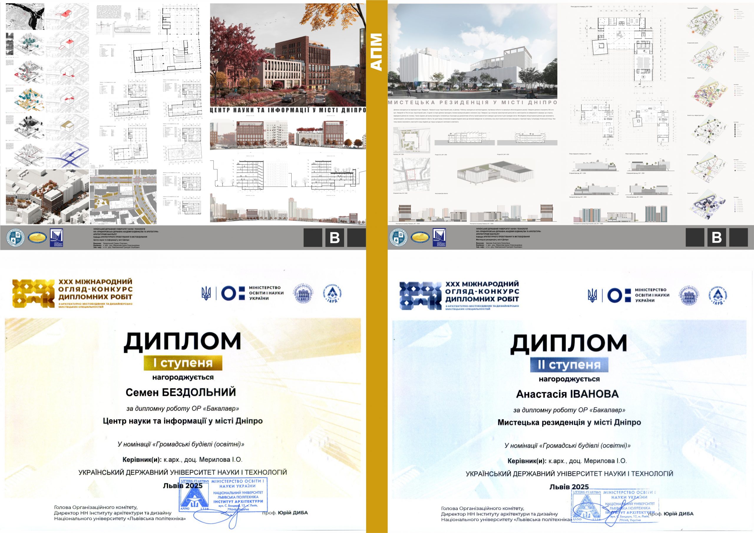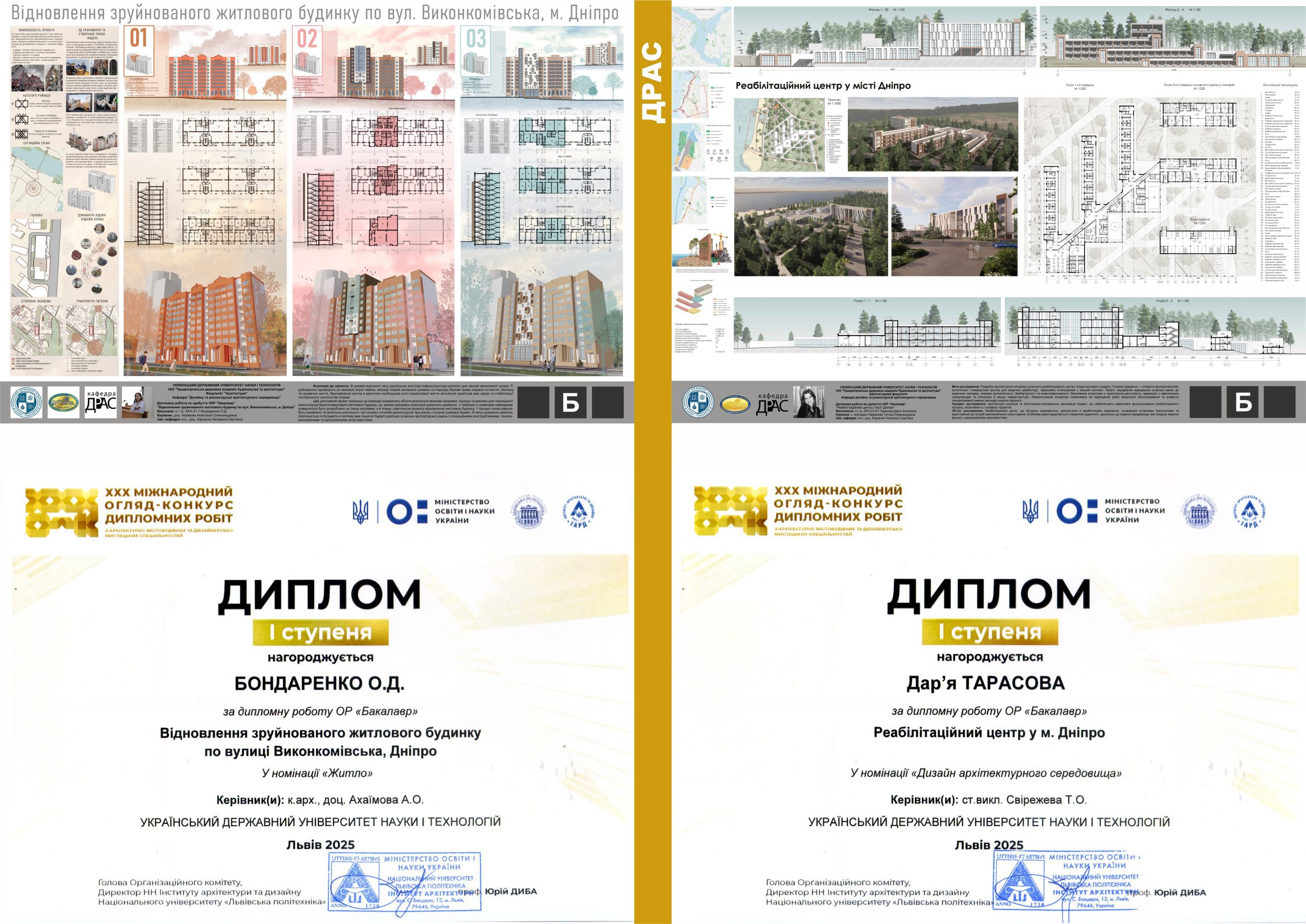 На XXX Міжнародний огляд-конкурс кафедри АПМ та ДРАС архітектурного факультету УДУНТ ННІ ПДАБА представили 18 проектів спеціальностей 191 «Архітектура та містобудування» та 022 «Дизайн»: бакалаври – 11 проектів, магістри – 7 проектів. Архітектурні проекти студентів ПДАБА були відзначені: каф АПМ – диплом I ступеня – 5 проектів магістрів, 1 проект бакалавра; диплом II ступеня – 5 проектів бакалаврів, а також Диплом Української Академії Архітектури та 3 Сертифікати відзнаки. Каф. ДРАС – диплом I ступеня – 2 проекти бакалаврів, дипломи II ступеня – 2 проекти магістрів, 3 проекти бакалаврів.